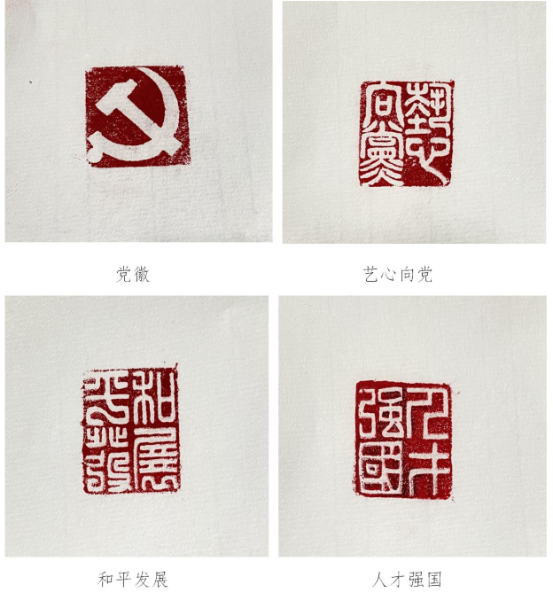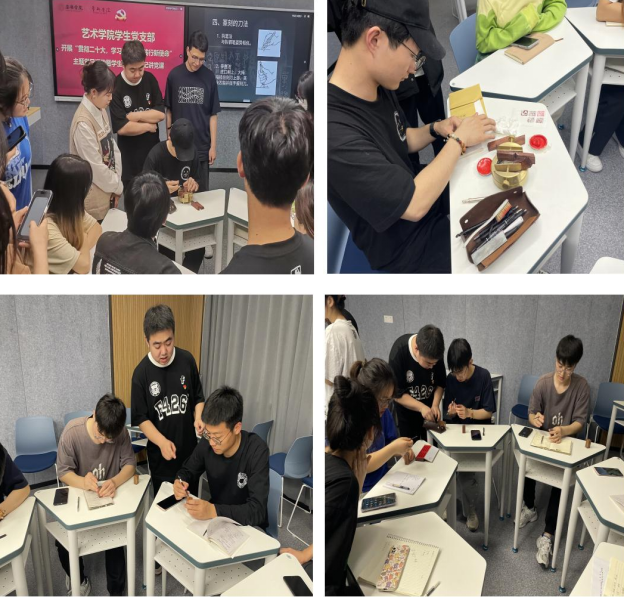 党课结束后,学生党员郝文超、吴胜柳、窦玮以“二十大关键词与篆刻艺术”为创新结合,带领同学们学习二十大精神、领悟关键词,同时学习中国传统文化瑰宝——篆刻的基本知识和技法。通过作品欣赏和实践互动,让参与者在体验中进行感悟、学习党的知识、增强民族自尊心和自豪感,让主题党日“活”起来,更具趣味性、吸引力和实效性,润物无声地传播好党的声音。