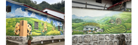 经过实地调研,队员们结合宁陕县的自然风光、海棠园村的产业特色和红色文化底蕴,确定了多个墙绘主题方向。在调研过程中,队员们重点关注了村里已有的墙绘作品。以养蜂产业为主题的墙绘,生动展现了养蜂人劳作的场景,还有可爱的卡通蜜蜂形象,很好地宣传了村里的特色产业;描绘自然景观的墙绘,樱花树下猫咪静卧的画面温馨动人,青山绿水间的乡村民居错落有致,尽显乡村的宁静与美好。这些墙绘作品不仅美化了乡村环境,也传递出乡村的文化内涵。此外,红色党建主题的墙绘也在规划之中,将进一步弘扬村里的红色文化精神。