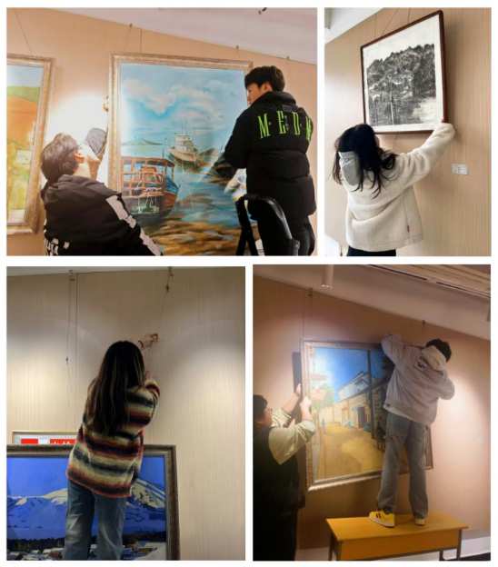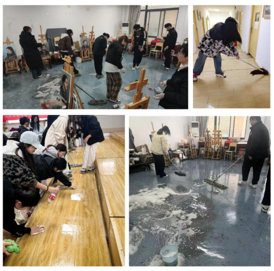 活动伊始,王兵老师首先向同学们强调了劳动实践的纪律要求和安全注意事项,讲解了此次劳动实践活动的目的、要求和价值意义,鼓励同学们积极参与其中。同时对美术作品布展中如何排布作品顺序,如何悬挂作品等细节做了示范讲解;对实训室的卫生清洁、地面墙面清理、桌椅画架摆放、物品整理等环节做了细致要求。随后,同学们分组展开行动,迅速投入到紧张有序的劳动实践之中。参与美术作品布置的同学们,把国画、油画等作品依次摆开,整齐的布置在展厅墙面上;参与实训室卫生打扫的同学,不放过任何一个卫生死角,把地面拖洗的干净整洁,把桌椅摆放的整整齐齐,营造出窗明几净的实训室环境。劳动过程中,同学们相互协作,配合默契,干劲十足,现场洋溢着欢声笑语,忙碌的身影随处可见。
