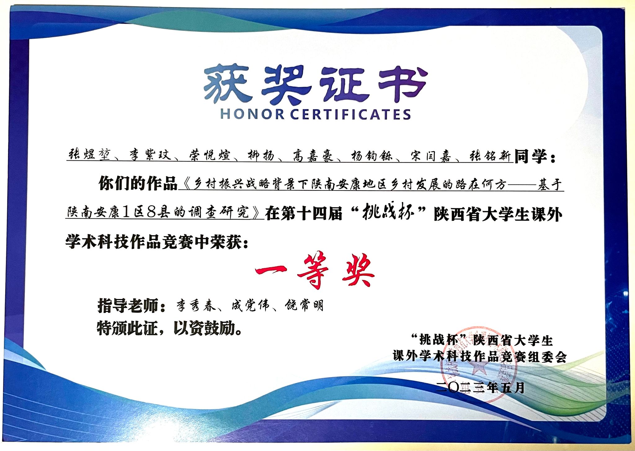 学生获得挑战杯陕西省省赛一等奖