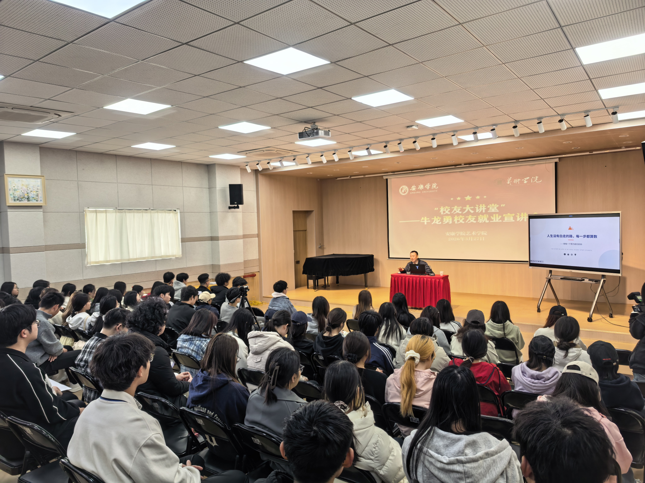 讲座中,牛龙勇校友以 “人生没有白走的路,每一步都算数——致每一个努力前行的你”为主题,牛龙勇校友结合自身学习经历、职业发展历程与成长感悟,围绕四个核心维度展开分享:一是引导大家认清自我、找准擅方向长,鼓励同学们立足艺术专业特色,在学习与实践中发现优势、深耕所长,把专业能力转化为核心竞争力;二是面对成长与求职路上的挫折要直面困难、学会坚持,他提醒大家低谷亦是沉淀,每一次坚持都在为未来铺路;三是针对自我怀疑与焦虑情绪,他寄语学子保持自信、不轻易否定自己,以积极心态接纳不完美,在自我肯定中不断突破;四是坚持终身学习、科学规划人生目标,把长期目标拆解为阶段性任务,在持续学习中更新认知、拓宽边界,让成长有方向、奋斗有路径。